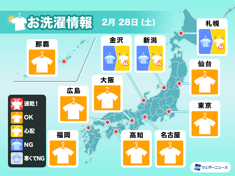 北海道は雪や雨、東北の日本海側から山陰では雨が降るため外干しはできません。明日3月1日(日)は天気が回復する所もあるので、洗濯物が少なければ明日にまわすのも良さそうです。