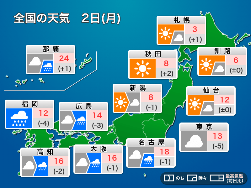 最高気温は福岡市が12℃、広島市が14℃といずれも昨日より低い予想となっています。東京都心も13℃止まりで、昨日に比べると5℃低い予想です。