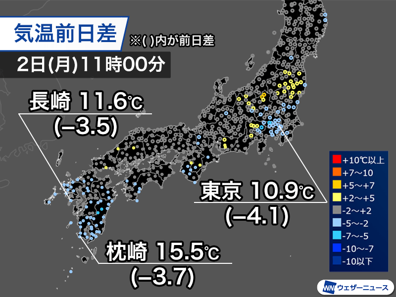 10時30分の気温は東京都心で昨日の同じ時間に比べて4.1℃低い10.9℃、長崎市は3.5℃低い11.6℃、鹿児島県枕崎市は3.7℃低い15.5℃となっています。