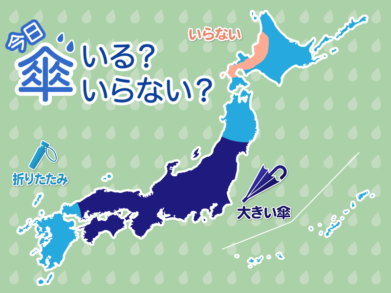 九州は午前を中心に雨の可能性があります。沖縄はにわか雨が心配です。必要に応じて傘をお持ちください。