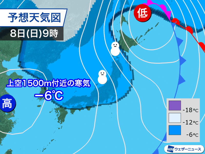 8日(日)になると低気圧はオホーツク海に進み、北日本を中心に冬型の気圧配置になります。平地で雪になる目安の上空1500m付近で−6℃以下の寒気が、大きく南下する見込みです。