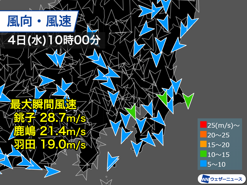関東は低気圧に近い房総半島や北西の風が吹き抜けやすい群馬県から埼玉県、東京湾周辺にかけて風が強まり、10時00分までの最大瞬間風速は千葉県銚子市で28.7m/s、茨城県鹿嶋市で21.4m/s、東京都大田区・羽田で19.0m/sを観測しました。