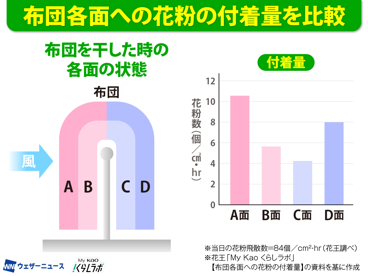 また、布団に直接花粉が付くのを防ぐ工夫として、表面を1枚余分な布でカバーして干すのもよいですね」(花王 コンシューマーインテリジェンス室)