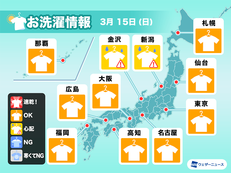 ただ、関東や静岡、北陸、山陰は下層シア(風の流れが変化する境界線)の影響で雲が広がってきます。北陸では午後、関東も夜はにわか雨の可能性があるため、取り込む時間にご注意ください。