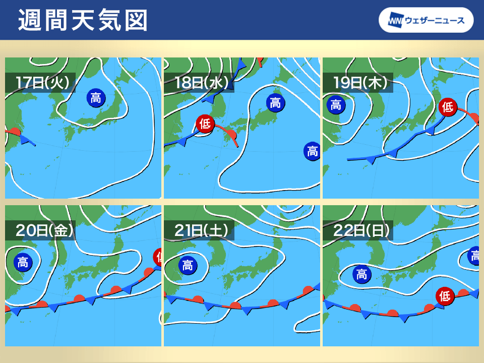 その後、18日(水)から19日(木)にかけて低気圧が本州付近を通過するため広範囲で天気が崩れます。西日本から雨の範囲が拡大し、東日本や北日本でも雨の降るところが多くなる予想です。