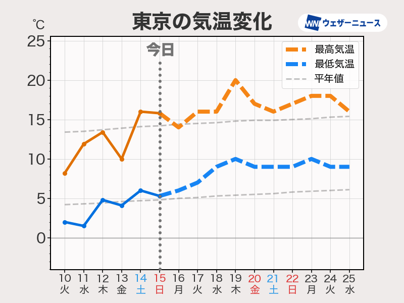 今週は気温が平年並みかやや高め日が続きます。東京でも日中は20℃近くに達する日がある予想です。北海道も10℃近くまで気温が上がる日が増えます。