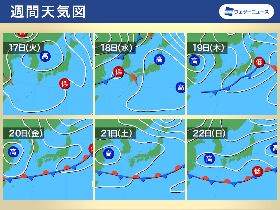 20日(金)・春分の日からは三連休です。この連休中は本州付近は高気圧に覆われ、南岸に前線が停滞する気圧配置となる予想です。