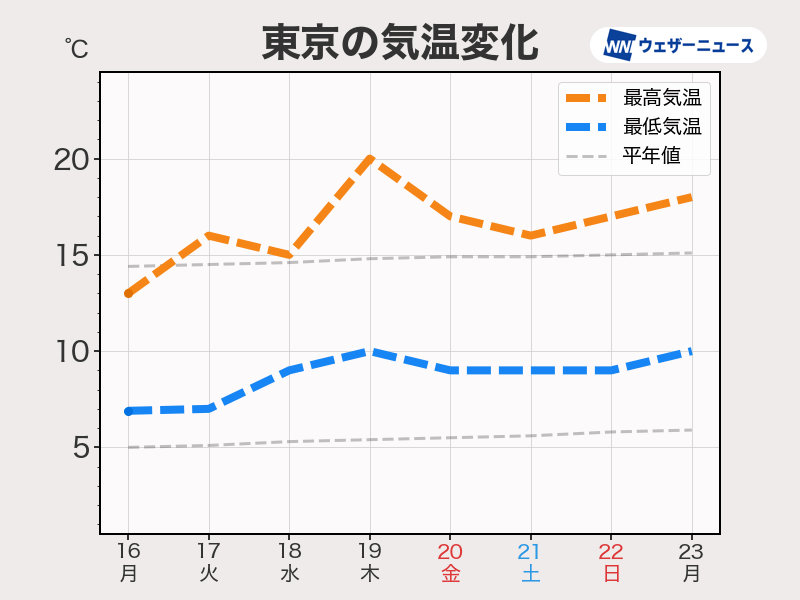 今週は気温が平年並みかやや高め日が続きます。東京でも日中は20℃近くに達する日がある予想です。北海道も10℃近くまで気温が上がる日が増えます。