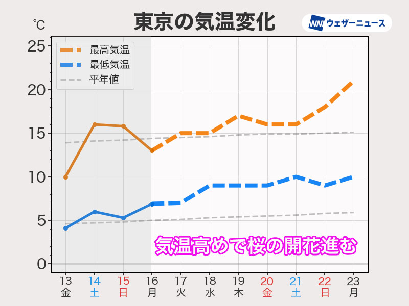 今日16日(月)は、岐阜と高知でソメイヨシノの開花が発表されました。この先も西日本や東日本で桜の開花が続々と始まる予想で、視覚でも季節の進みを感じられる一週間となりそうです。