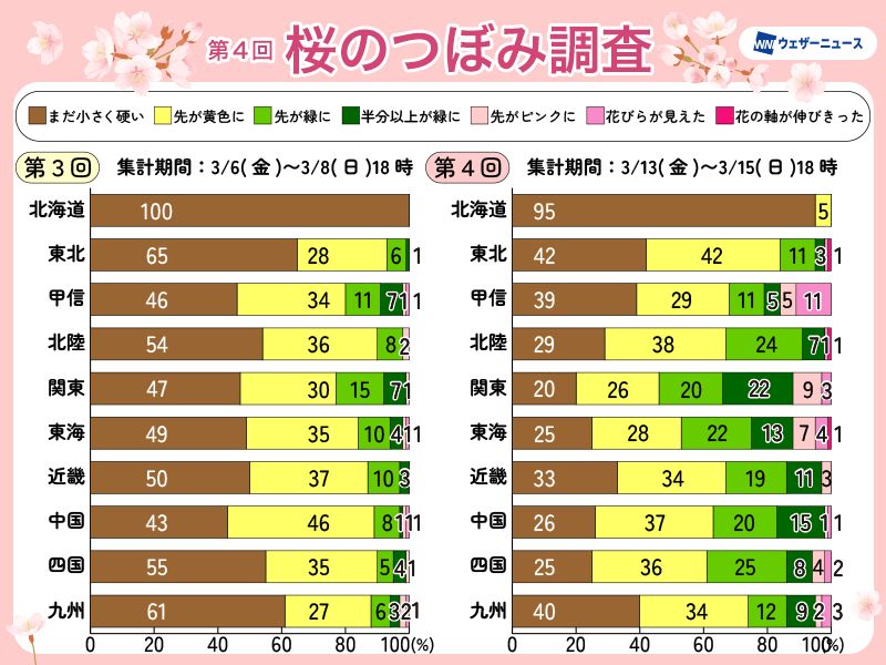 前回の調査結果「第三回桜のつぼみ調査 春の陽気が生長を後押し 「半分以上が緑に」が増加」