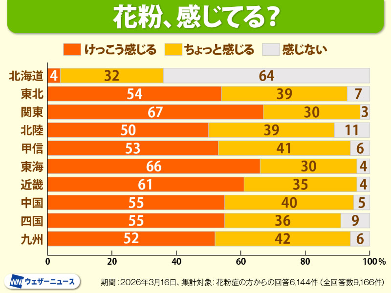 ウェザーニュースが3月16日に「ここ1週間で花粉感じてる?」という質問でアンケート調査を実施したところ、全国的には「ちょっと感じる」と「けっこう感じる」を合わせた割合は、全体の94%に達しています(「花粉症ではない」の回答を除いた6,144件が対象)
