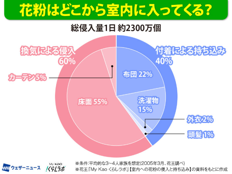 「室内に入ってくる花粉は、1日に約2300万個にもなります。約6割が換気のための窓の開け閉め、ちょっとした隙間からの侵入です。残りの約4割は、布団や洗濯物に付着した花粉の持ち込みとなります」(花王 コンシューマーインテリジェンス室)