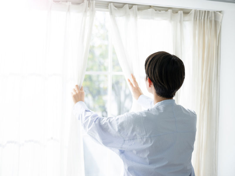 窓を開けるときは10cm程度にして、網戸やレースのカーテンを閉めておきます。これらのことで、花粉の室内への侵入を大きくカットすることができます。