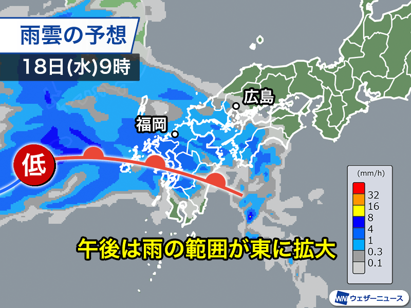 18日(水)の朝は朝鮮半島の南に低気圧が進み、前線がのびてくる九州は北部を中心に朝から雨が降り出します。