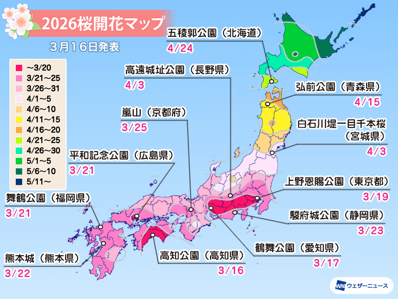 今日16日(月)に岐阜と高知でスタートした全国の桜の開花は明日17日(火)に名古屋、明後日18日(水)は東京へと進む見通しです。来週までには関東以西の広い範囲で開花し、4月に入るとともに東北南部で咲き始める予想となっています