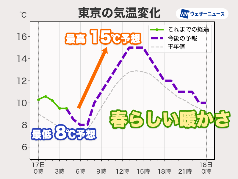 関東は朝と夜に雲が広がり、南部は夜遅い時間ほどにわか雨の心配があります。ただ、日中は晴れ間が多くなり、最高気温は15℃を超える所が多く、春らしい暖かさとなりそうです。