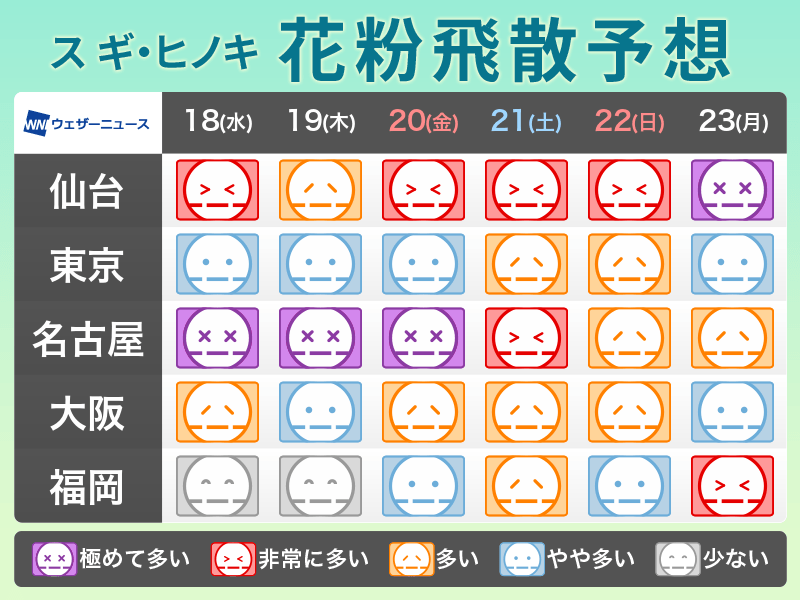 ただ、スギ花粉の飛散はピークを迎えていて、ヒノキ花粉も西日本や東日本で飛散が始まりつつあります。症状の出やすい方は、引き続きの万全の対策が欠かせません。