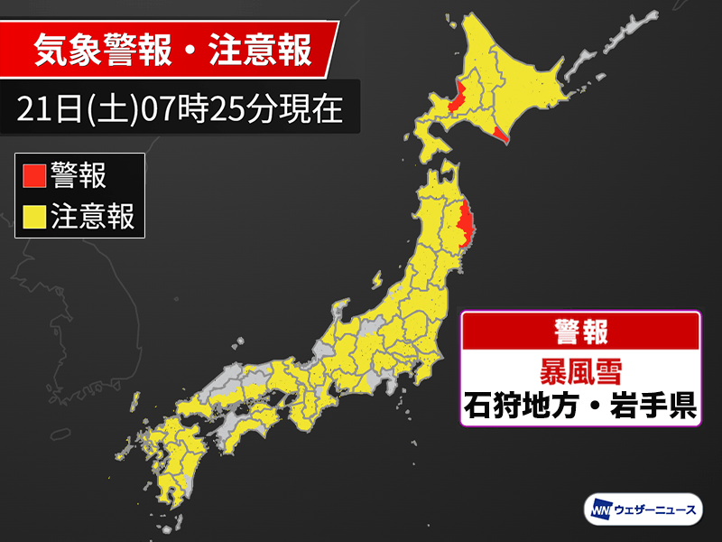 7時30分現在、北海道日高地方に暴風警報、北海道石狩地方と岩手県沿岸部では暴風雪警報が発表されています。