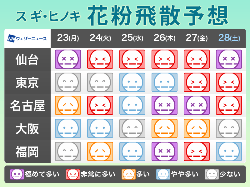 東北から九州にかけてはスギ花粉の大量飛散が続いていて、西日本や東日本ではヒノキ花粉も徐々に本格化する見込みです。特に雨が止んだ後は花粉の大量飛散にご注意ください。