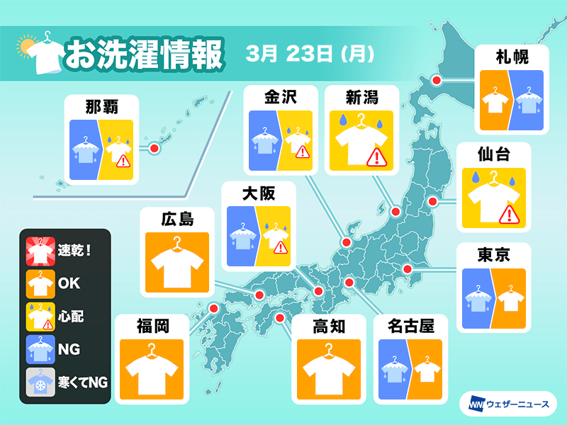東海西部や西日本では朝までに雨のやむところが多いものの、近畿などでは一旦雨がやんだあと午後もにわか雨が心配です。外干しはやめておいたほうが無難です。