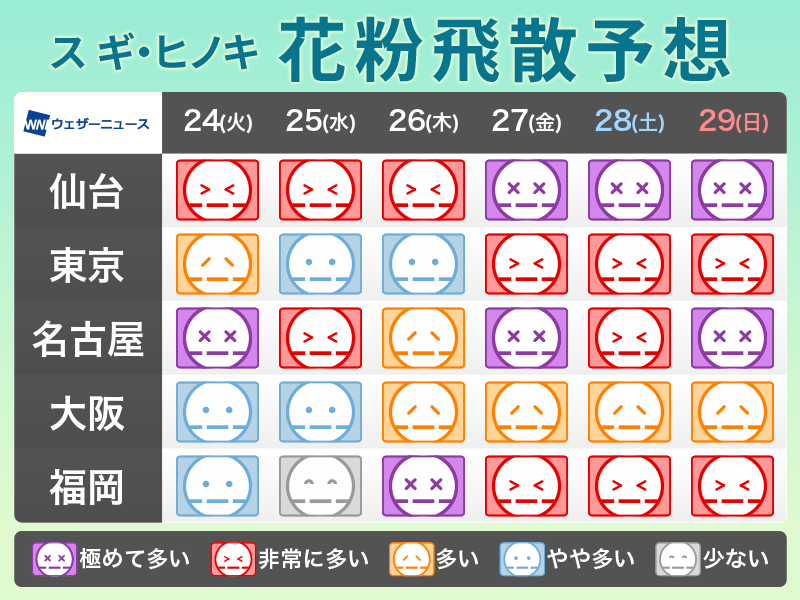 東北から九州にかけてはスギ花粉の大量飛散が続いていて、西日本や東日本ではヒノキ花粉も徐々に本格化する見込みです。特に雨が止んだ後は花粉の大量飛散にご注意ください。
