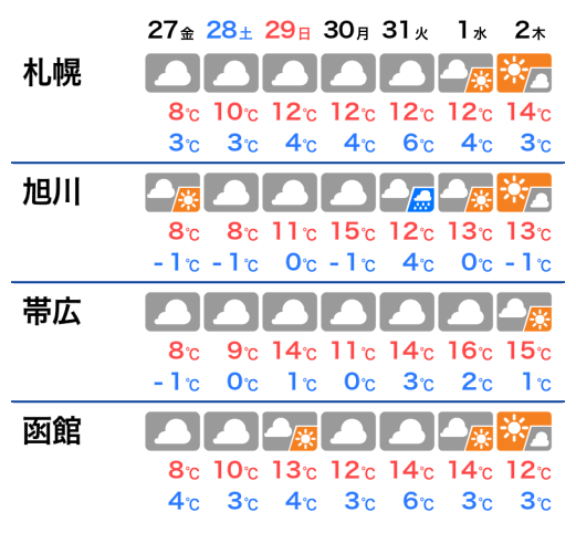 今日26日(木)は本州南岸を通過する低気圧の影響で東日本を中心に雨が降っています。一方、低気圧から遠い北海道では青空が広がっています。気温も上昇し、札幌の最高気温は11℃の予想で、融雪がさらに進むとみられます。