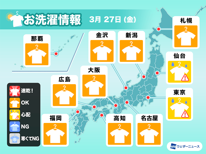 道南から東北太平洋側はにわか雨の可能性があり、北海道日本海側は夜遅くに雨の降る可能性があります。帰りが遅くなる場合は部屋干しが安心です。