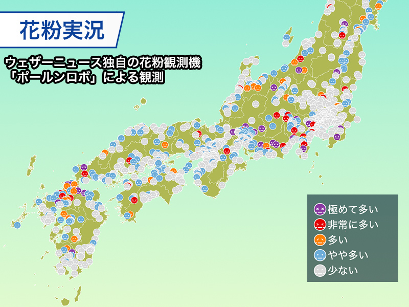 ウェザーニュース独自の花粉観測機「ポールンロボ」による観測によると、九州北部や東海、甲信や北陸で花粉が大量飛散しています。