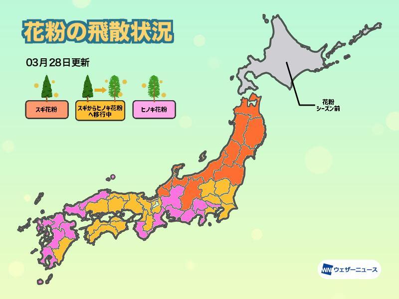 元々ヒノキの木が少ない東北や北陸ではスギ花粉の飛散がメインです。