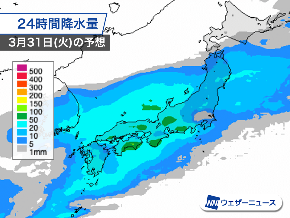 31日(火)の低気圧が東に離れたあとも前線が本州の南に停滞し、翌4月1日(水)は前線上の低気圧が本州の南岸を東進する見込みです。一度天気が回復しても再び雨の降る可能性があるためご注意ください。関東では2日(木)も影響が続く可能性があります。