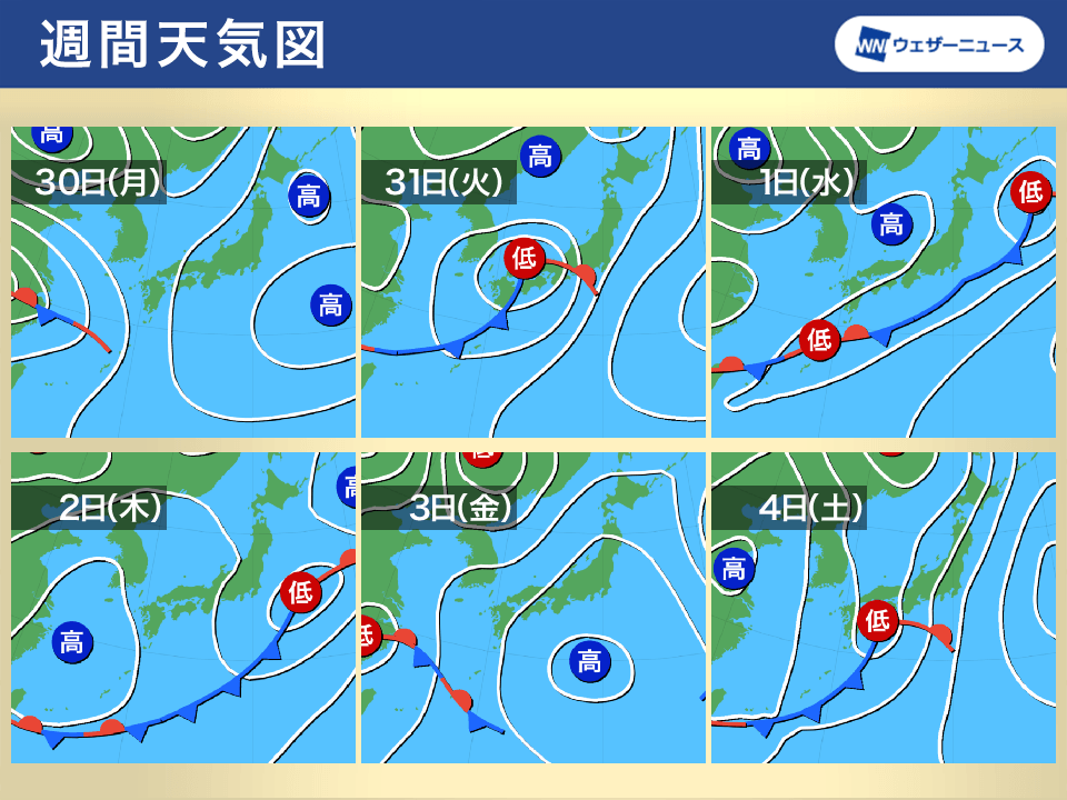 明日30日(月)からは天気が下り坂で、だんだんと雲が優勢となり九州などで雨が降り始めます。31日(火)は低気圧が西日本から東北地方へ進み、広範囲で本降りの雨となる予想です。