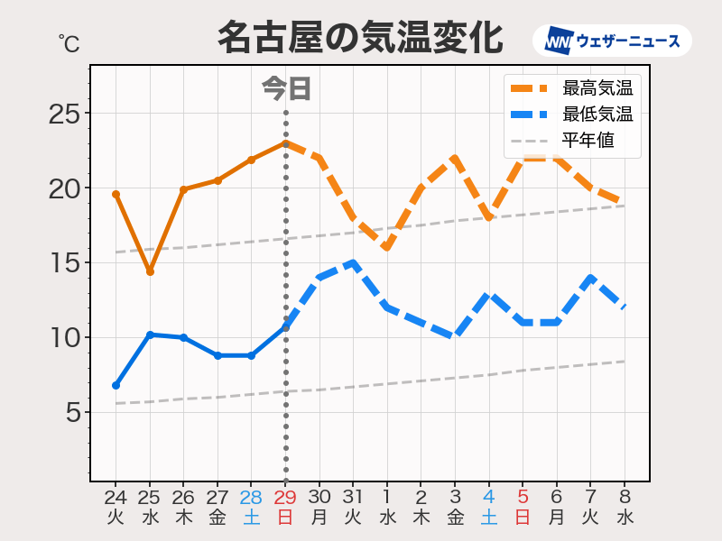 この先一週間は気温が平年より高い日が多いものの、低気圧の進路や雨によっては平年並みに下がる日も予想され、日ごとの気温差に注意が必要となりそうです。