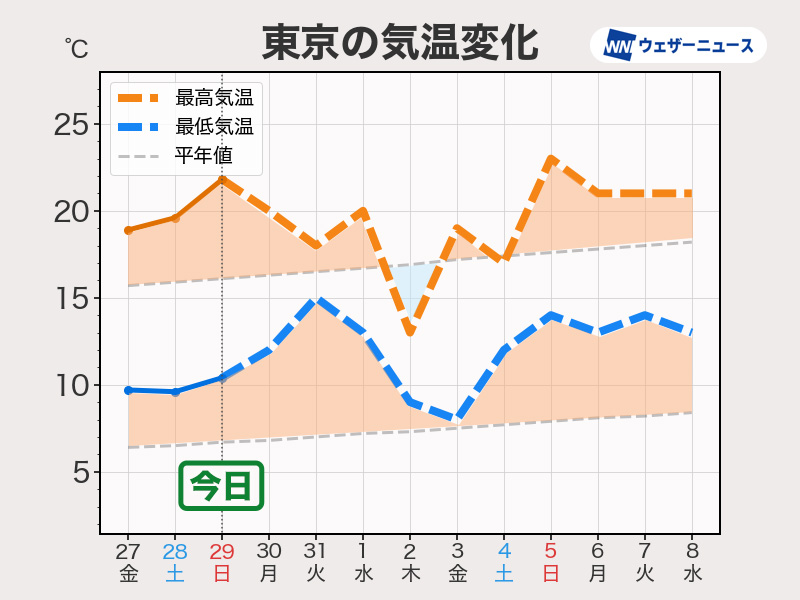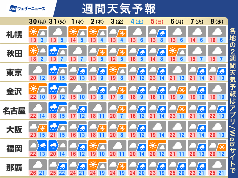 ただ、低気圧の進路や雨によっては気温が平年並みとなる日も予想され、日ごとの気温差に注意が必要となりそうです。