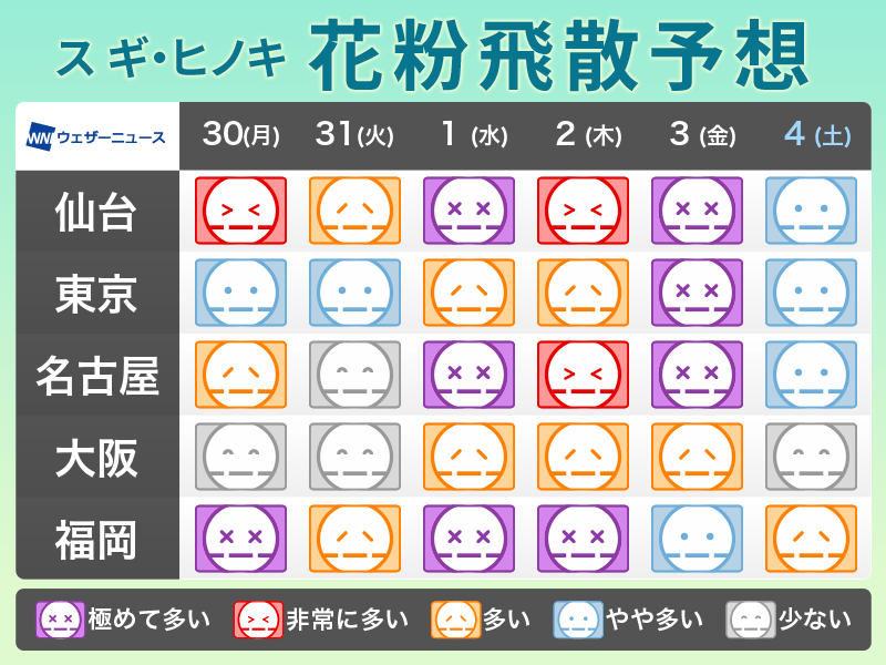 東北から北陸はスギ花粉のピークを迎えています。関東から西日本では徐々にスギ花粉のピークを越えつつあり、ヒノキ花粉が本格化している所もあります。特に雨上がりには花粉の大量飛散に注意が必要です。