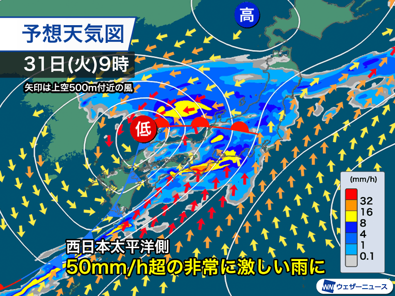 明日31日(火)の朝には低気圧が山陰沖に進む予想となっています。低気圧に向かって吹き込む湿った風は一層強まり、西日本の太平洋側を中心に雨雲が発達する見込みです。