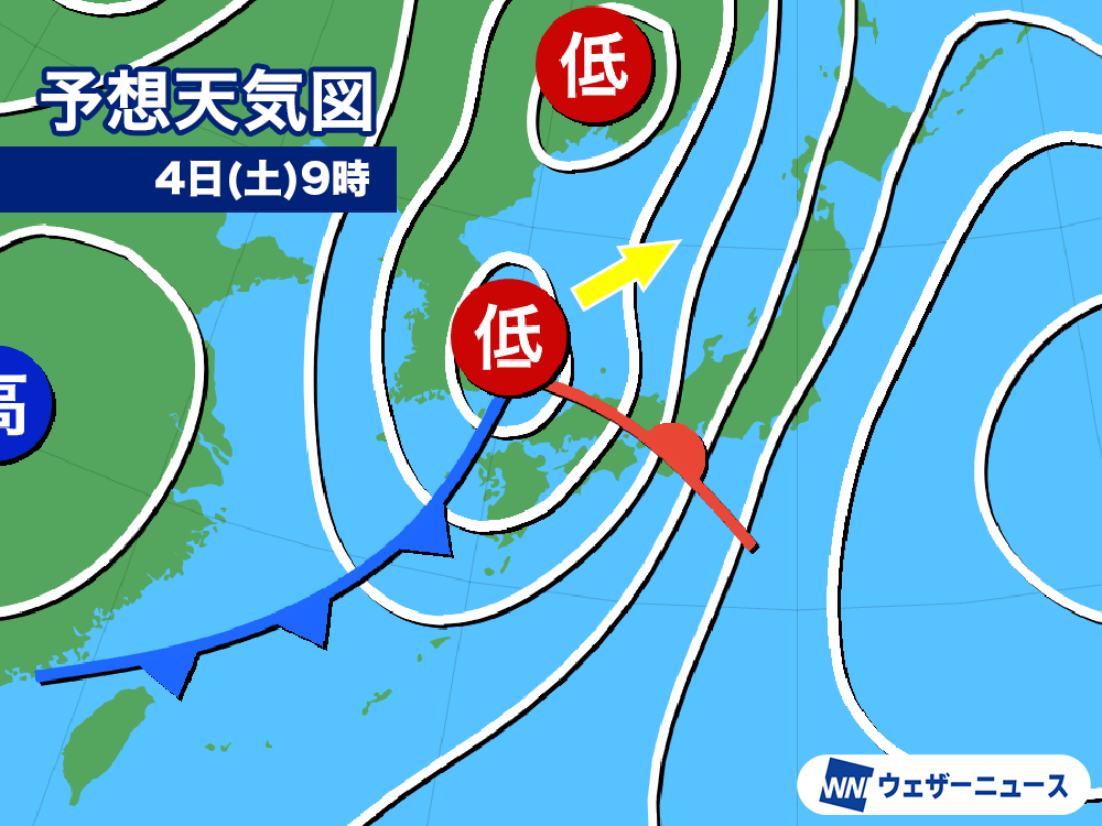 今週末は再び低気圧が東シナ海から日本海へ進み、西日本や東日本で雨や風が強まる可能性があります。西日本では明後日3日(金)から天気が下り坂となり、4日(土)は西日本〜東日本の広範囲で本降りの雨となる予想です。