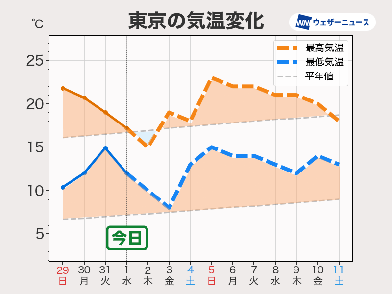 この先一週間は、気温は平年並みか高めとなる日が多い予想です。ただ、今日は西日本で、明日は東日本で気温が低めの日も予想され、日ごとの気温差に注意が必要となりそうです。