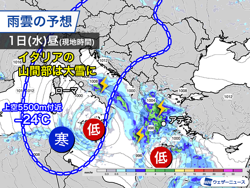 低気圧の周辺では大気の状態が不安定になっているため雨雲が発達しやすく、イタリアやギリシャでは局地的に雷を伴った強い雨が降りやすくなります。