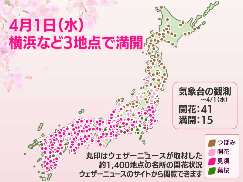 今日の桜開花状況 4月1日(水) 横浜など3地点で満開