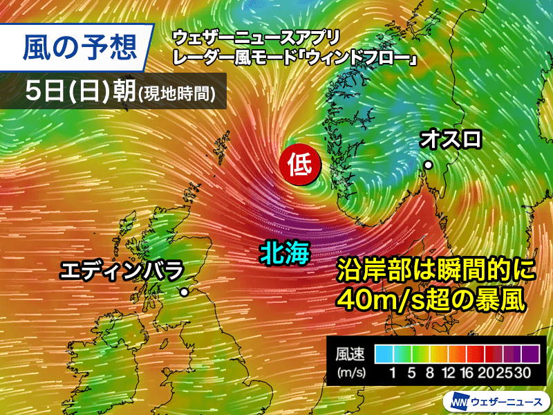 特にノルウェー南部の北海沿岸では風が強く、現地時間の5日(日)午前をピークに最大瞬間風速が40m/s以上に達する見通しです。気象当局は最も高いランクに当たる赤色警報を発表しました。