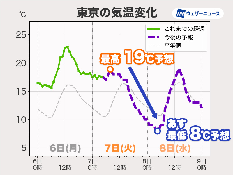 雨が降る分、全国的に昨日6日(月)ほど気温は上がらない予想です。最高気温は平年並みの所が多く、季節先取りの暖かさは落ち着きます。