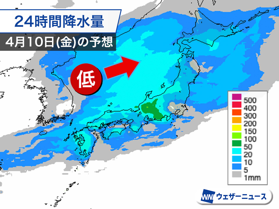 10日(金)は低気圧が発達しながら日本海を進み、北日本へ接近。西日本から北日本にかけては雨が降り、風も強まって荒れた天気となる可能性があります。南からはこの時期としてはかなりの水蒸気が流れ込むため、西日本や東日本の太平洋側を中心に雨雲が発達し、強雨や雷雨、局地的には大雨となるおそれもあります。