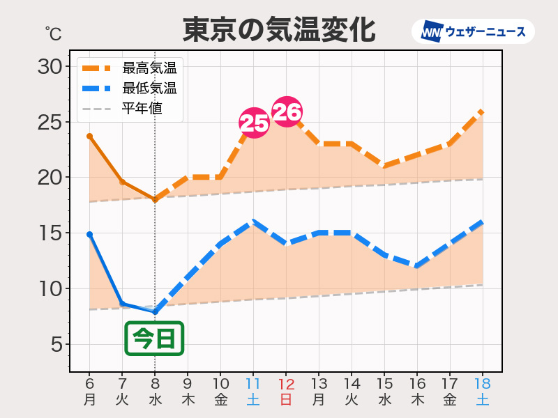 今日8日(水)にかけてはこの時期らしい体感の所が多くなりますが、その後は再び平年より高めの気温で推移するとみられ、次の週末は東京・名古屋・大阪でも最高気温が25℃以上の夏日予想となっています。