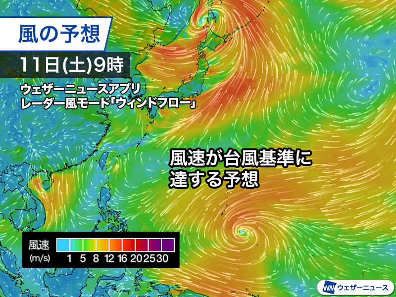11日(土)朝の風の予想を見ると渦は明瞭になり、最も強い領域では平均風速が16〜20m/sに達する見込みです。台風の基準となる18m/s以上になる可能性が高くなっています。