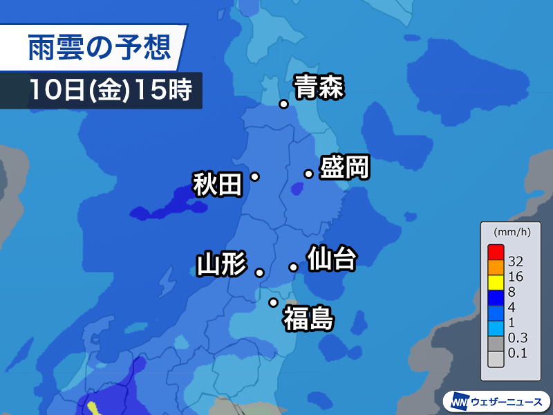 低気圧が発達しながら日本海を進み、明後日の午後は東北の広い範囲で雨が予想されます。一時的に雨が強まる可能性があり、南寄りの風も強まる見込みです。咲き出すのが早かった桜はこのタイミングで散り始めてしまうかもしれません。