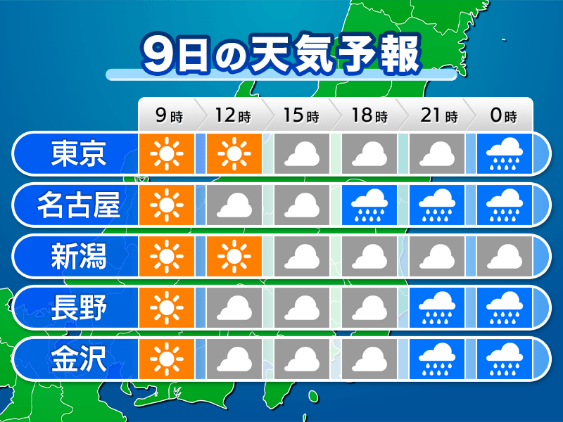 東海や関東など東日本は高気圧に覆われて、午前中を中心に晴れる所が多くなります。夜は雨が降り出す可能性があるため、帰り道に備えて折りたたみの傘などをご用意ください。