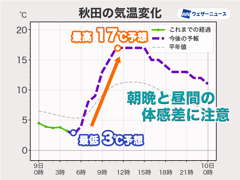 昼間は昨日8日(水)以上に気温が上がって、春の暖かさを感じられる一日となりそうです。内陸部では朝と日中の気温差が大きくなりますので、服装で上手に調節してください。