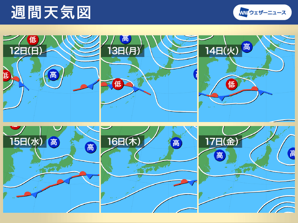 来週前半は本州の南に前線が停滞する日が続き、九州や四国、本州の太平洋側の地域を中心に雨の降るところがある予想です。前線の位置次第で雨の範囲が変わる可能性があるため、こまめに最新の天気予報をご確認ください。