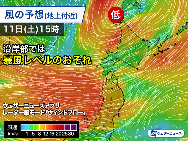 低気圧に近い北海道は日本海側を中心に雨が降り、風も強く吹きます。沿岸部では暴風レベルとなるおそれもあり、横殴りの雨にも注意が必要です。