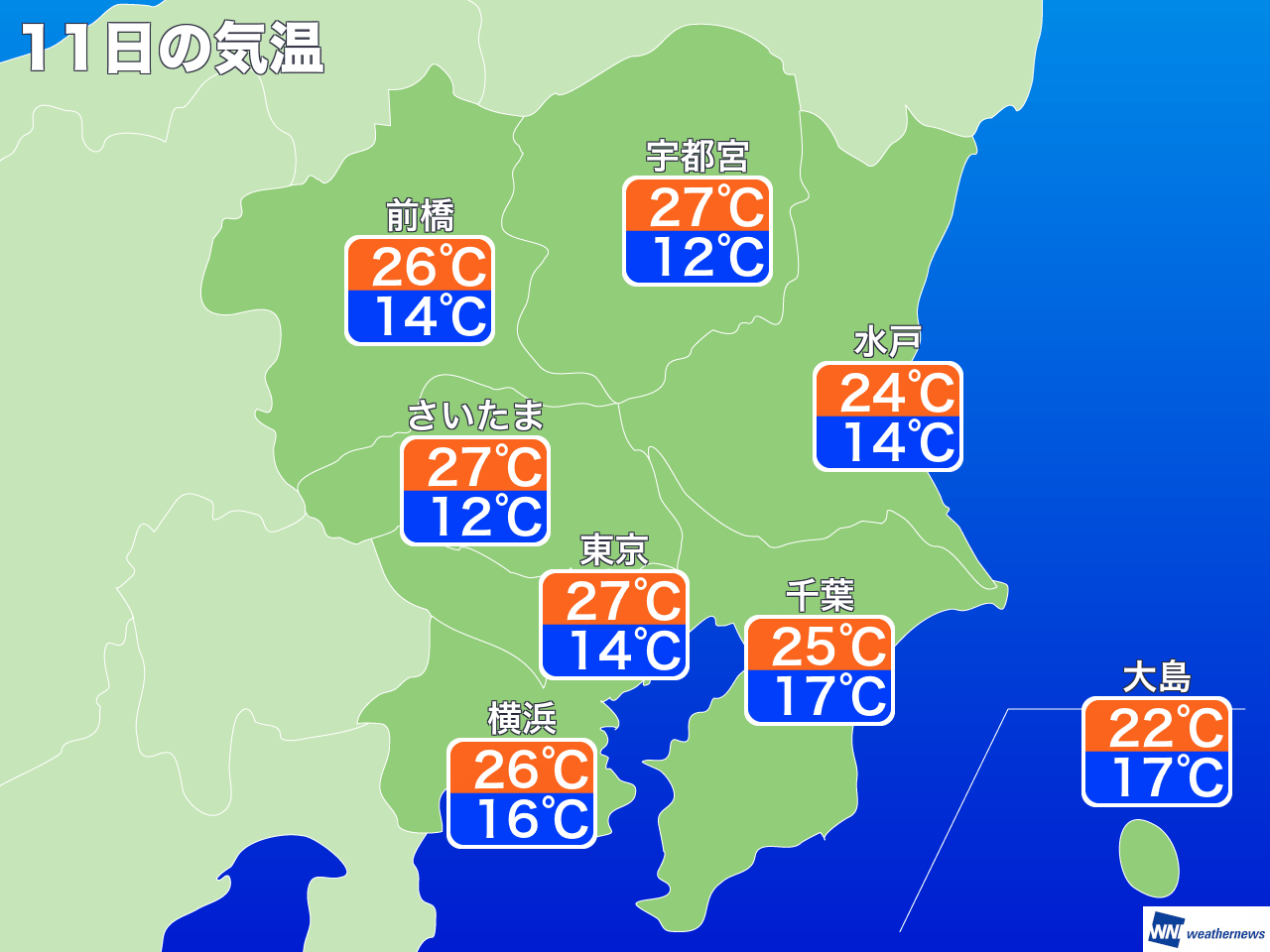 昨日は一日を通して曇りや雨で気温が上がらなかった関東では、今日11日(土)は一転して晴れ、日中は汗ばむ陽気となります。